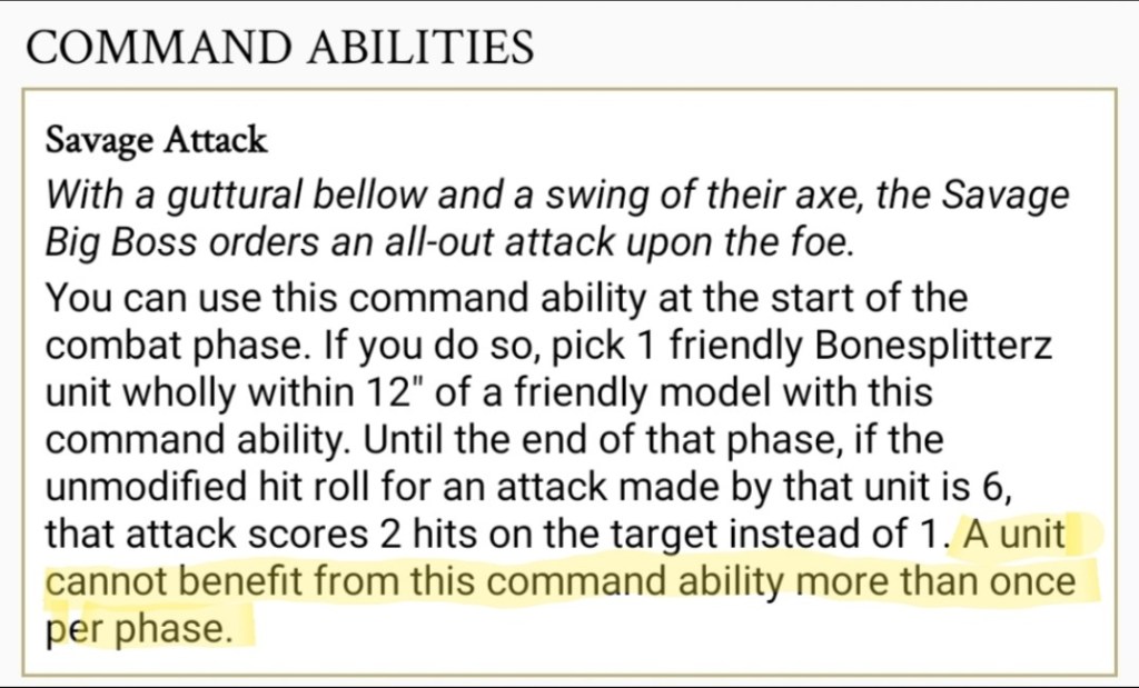 You’re also giving up on access to some of the best Command Abilities in the game (Mighty Destroyers and the Ironsunz counter charge) to spend all your resources on generating yet more Ardboyz, and the whole thing hinges on a small Hero that can readily be sniped.