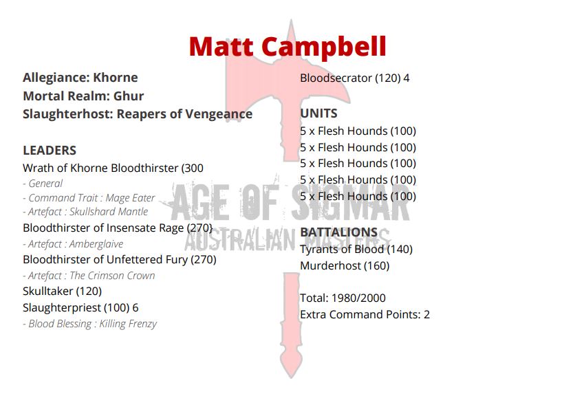 Matt is Khorne’s Chosen on the Australian scene, putting together a string of stunning successes with a Battletome that some lesser players have written off as uncompetitive.
