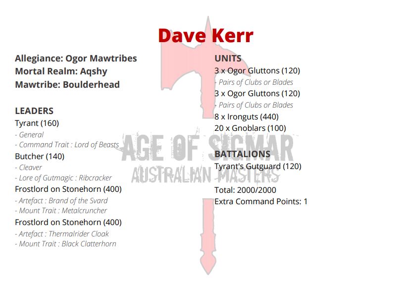 Dave is the reigning back-to-back Master and has nothing left to prove. Running Ogors in a hyper-competitive field like this is a bold move, given the amount of Depravity you would bleed out to Slaanesh; however it looks like it has paid off, with only one such army to avoid.