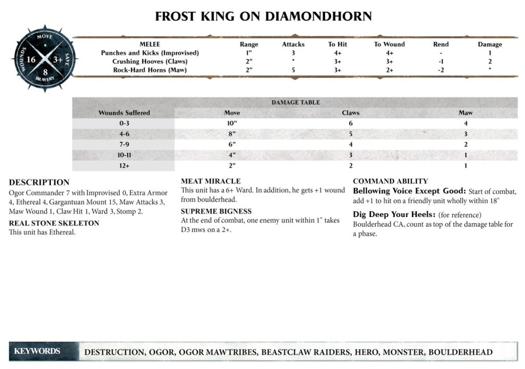 We all know he’s a Frostlord on Stonehorn, but he won’t have those keywords, so he can’t access any Command Traits or Artefacts outside of the subfactions (since they are hard keyword locked) – but that’s ok, he fits fine in Boulderhead, and we’re golden. Unfortunately he also won’t get a Mount Trait, but hey, he does have his own charms, right?