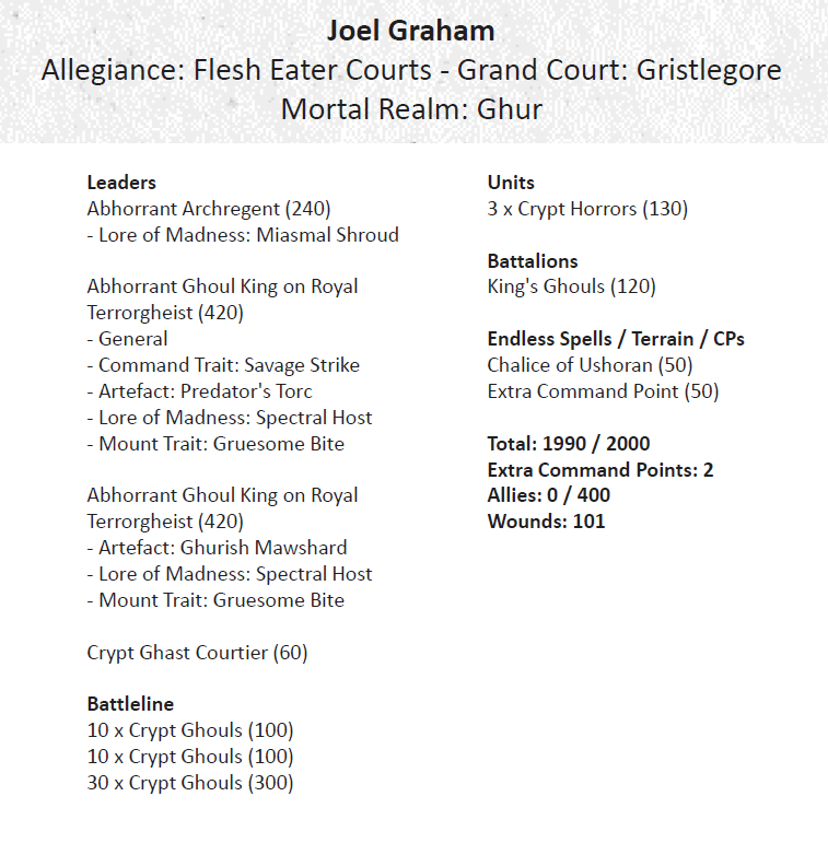 Very few combat armies can hang with Gristlegore, even with the book starting to show its age; most armies in the meta have no more than one or two big hammers. You need to kill my Terrorgheists…and when you do, you better be damn well sure he’s taking them down with him.