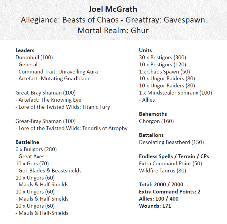 Day one was Everchosen starring Archaon and 9 Varanguard, followed by Beasts of Chaos and Feast Day FEC. To put it simply, Gristlegore’s fight on death is too powerful for all of these armies, and with some smart positioning and playing around the double it was fairly elementary, my dear Watson.