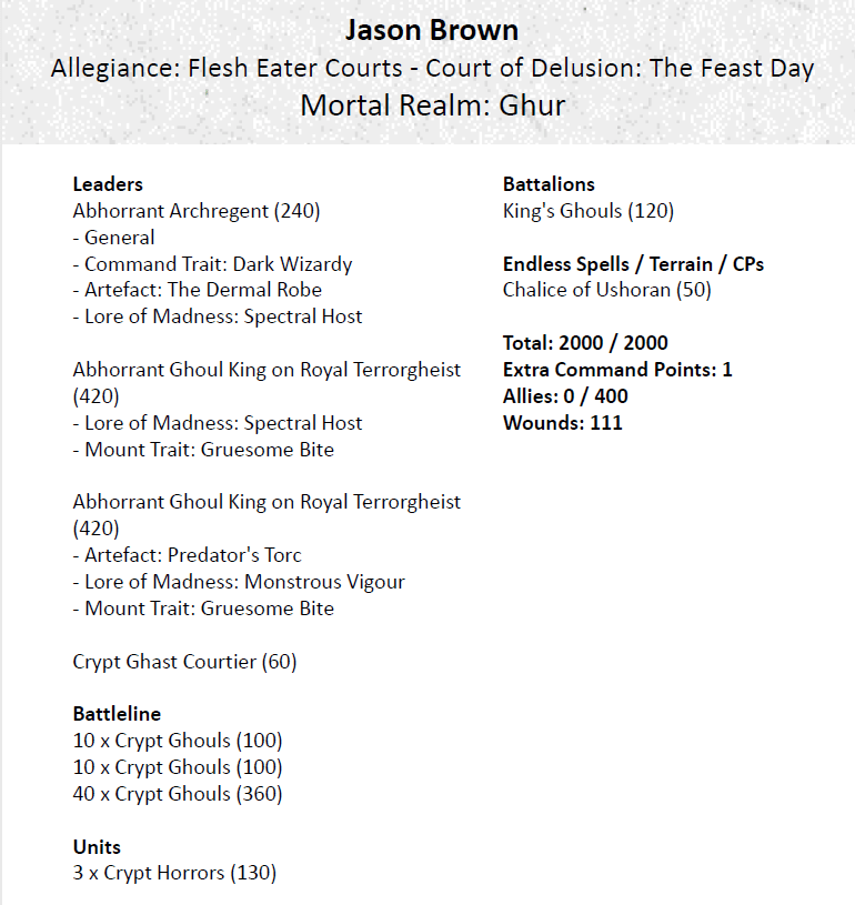 I believe the list is favoured vs K.O. so I wasn’t worried about the stunties, but things like Seraphon, Lumineth, Cities (Hallowheart) and Fyreslayers are terrifying for my poor Ghouls. There was a bit of luck involved to avoid them.
