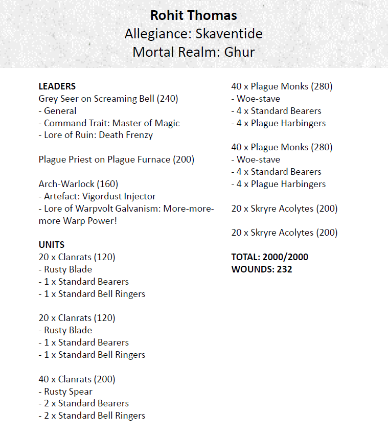 Day two was the big day where I really earned my chops. First up was Total Commitment against a Skaven list run by Rohit Thomas, an absolute gentleman. This army was sporting 200+ bodies, including 80 Plague Monks and 40 Skryre Acolytes. Lucky he’s a nice guy.