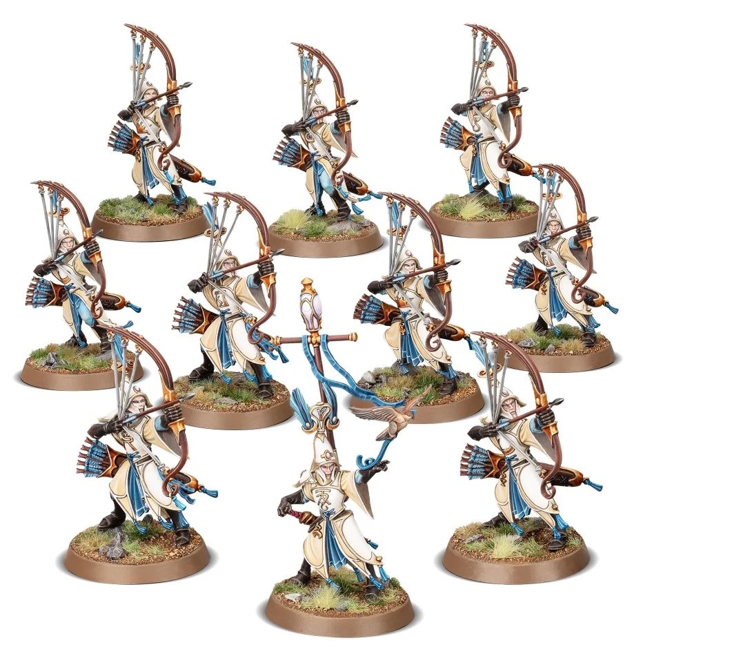 Scryhawk Lantern: At the start of your shooting phase, you can pick 1 enemy unit within 30″ of this unit’s High Sentinel that is not visible to them. If you do so, you must choose the Lofted missile weapon characteristic for all attacks made with this unit’s Auralan Bows in that phase, but that enemy unit is treated as being visible to all friendly models from this unit until the end of that phase.