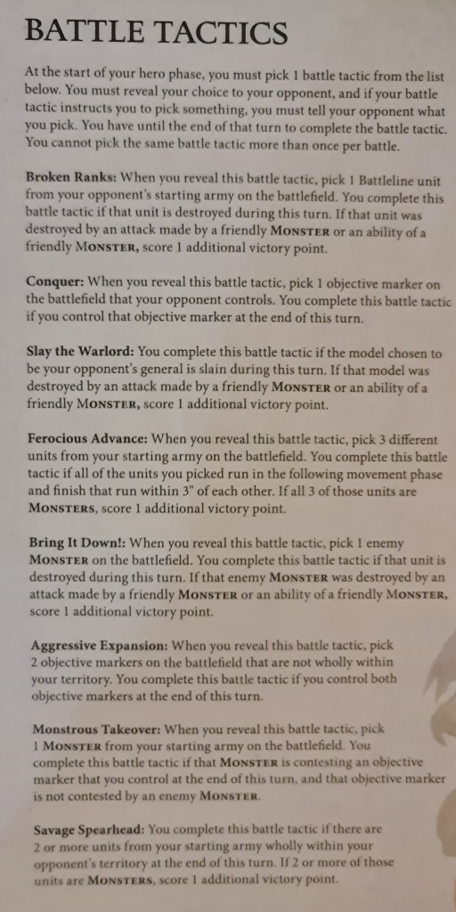 I wish I could give you a flow chart of which Battle Tactics to select in which sequence for every game, but AOS has never been as simple as the T9A crowd seem to think it is. But there are a couple of pointers that will stand us all in good stead:
