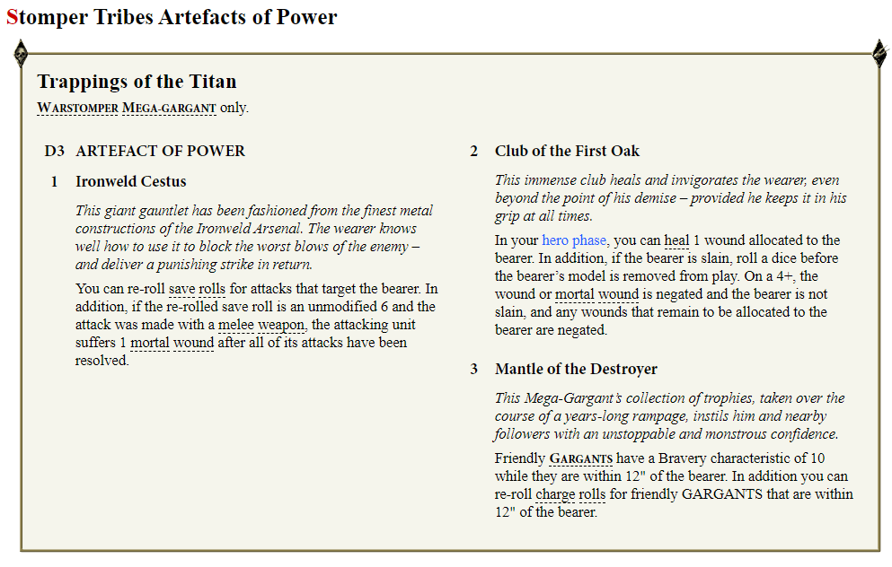 Add in the fact that a lot of the big bads in the current meta shit all over your Giants in combat (Gotrek and Archaon spring to mind), and my preferred competitive direction is leaning heavily into Enhancements that give us extra survivability. Now let’s not go crazy – sometimes the best defensive play is to remove a glass hammer; and the best aggro option can heavily outmatch the diminished returns of the 4th-best defensive choice. But we do know which way the table is tilted with our Enhancements.
