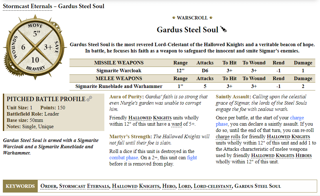 I love how they’ve brought a fan-favourite character from Black Library to life on the tabletop. There’s nothing particularly subtle about a 5++ ward bubble, but man it’s nice to have, and with Saintly Assault he does a lot for his chums in combat too. Only the Faithful, indeed.