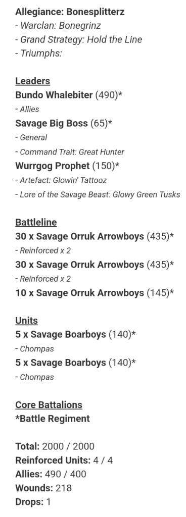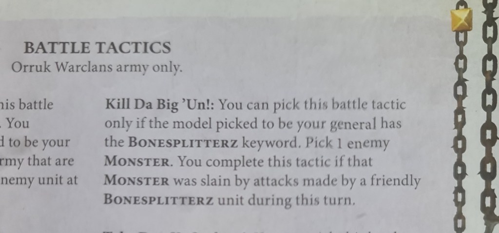 The Grand Strategy (keep a Battleline unit alive) should be a lock in all but the most extreme circumstances, especially with the 4++ ward turn – in fact, Bonesplitterz can regularly deny their opponents Broken Ranks even with minimum Battleline units on the Waaagh turn. So those 30 blocks should be grand.
