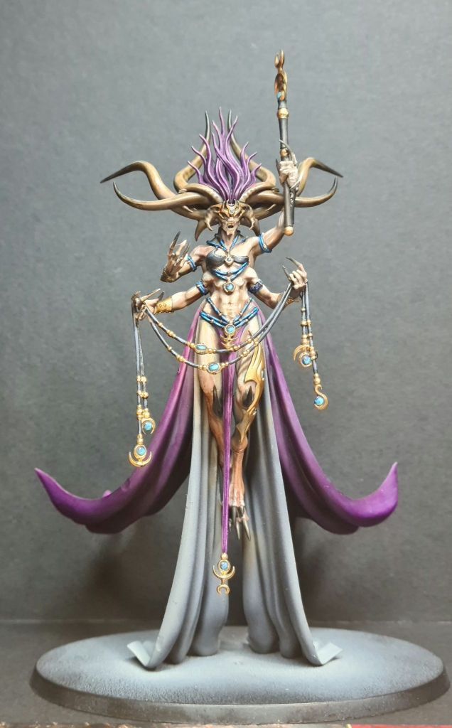 First rule of making Slaanesh cool: you need a Keeper. And what’s cooler than a normal Keeper? A Keeper that can Fly over 30″ thanks to its smaller-than-normal base, Levitate and the Boatman. What Loophole Luke has figured out is that the Forgeworld Keeper comes on an oval base that sneaks within Lauchon range – fun detected!