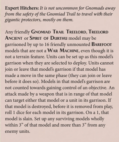 The old ways are not forgotten in Gnomad society, and nowhere is this embodied more than on the ancient and bountiful Gnomiad Trails of Ghyran. The merry souls who tend these Trails have a special affinity with the Sylvaneth, and may even be found peeking out from the cosy nook of a larger chum: