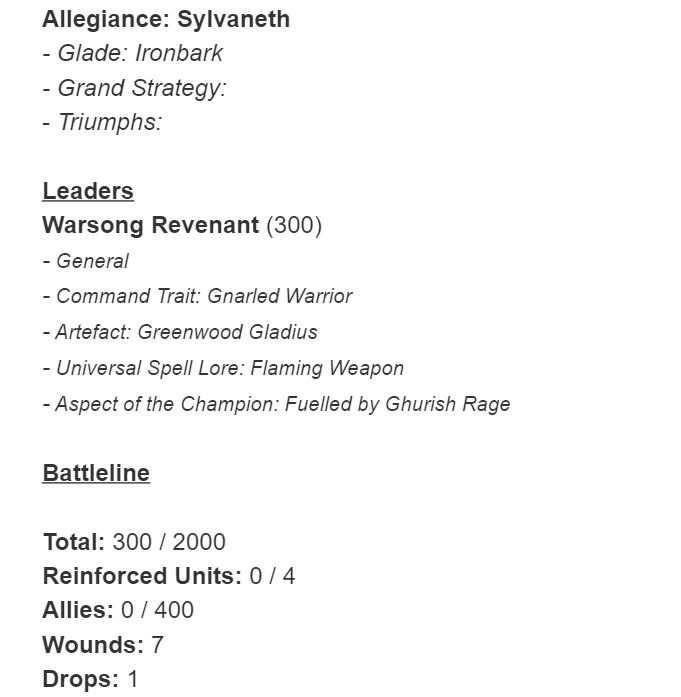The Warsong Revenant is the ultimate Galletian Champion. He has 7 wounds, a 5+ save and a 4+ ward. Thanks to the Command Trait Rend-Be-Gone Gnarled Warrior he becomes Ethereal too. Nice!