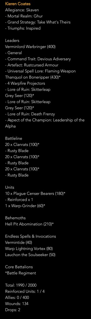It’s a really good spread and I think a good reflection on the health of our scene that there wasn’t five GSG or LRL. I certainly didn’t expect Kruleboys or two Skaven; Ogors could have been a strong contender as well that weren’t present. I did think there might have been more GSG.