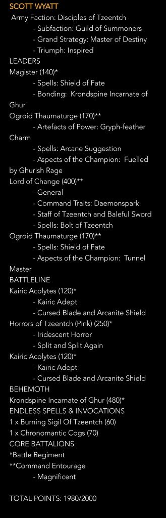 My game 2 into Tzeentch was the closest and Scott is a great player. Tzeentch is another toolbox army that has outs and tricks that allows them to keep scoring and moving. That game is a trade and attrition game, I have the slight edge due to Teclis bouncing enemy spells back at them.