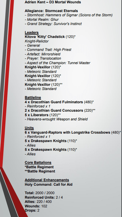 By this stage, we all know exactly what 4 Fulminators prowling around can do, and Concussors bring more ranged MWs because Adrien didn’t really have much of that. Stormcast can famously be slow once they’re down, but leaning into the Cavalry side (including the interesting Drakespawn Knights Allies) should help with that, along with High Priest to get Translocation firing.
