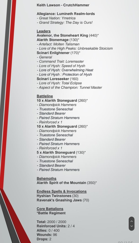 For all the shit I enjoy giving them, there are a few Order armies that have caught my attention over the years, and this is one of them. The Stoneguard are obviously not amazing at holding objectives, but nor will your units be once they’ve been ground down through Ymetrica’s attrition game. I’m afraid that those 96 wounds will disappear pretty quickly in some games when the MWs starting banging into them (especially when the situational Fortitude ability is not in play), but Keith knew that when he brought the list, and this army will look fucking baller on the table.