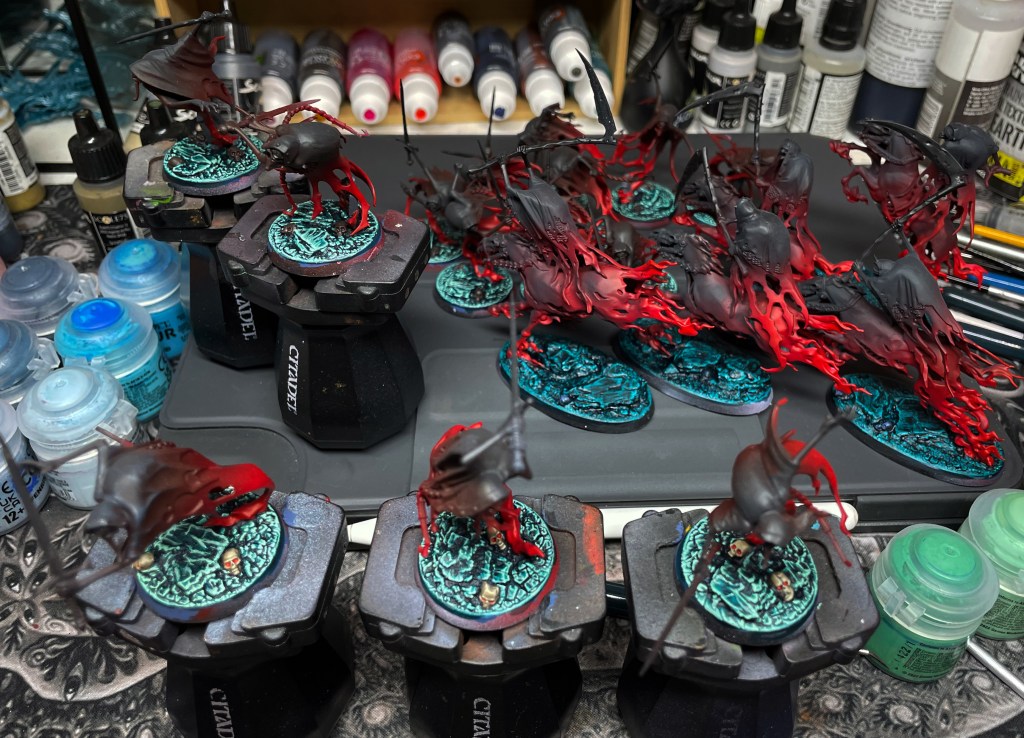 If you’ve been around the hobby for a hot minute you might have heard a term called “batch painting,” which is a way of taking a large group of models (let’s say 20) and on every single one of those models you paint all of the red bits until all 20 have their red bits done, then you start back at the first and do all of the gold bits until all 20 have their gold bits done, etc etc. Until finally the last batch is to do 20 Abbadon Black base rims and call it done. Painting an army is best done utilising some kind of plan and personally I always find myself back to doing some version of batch painting.