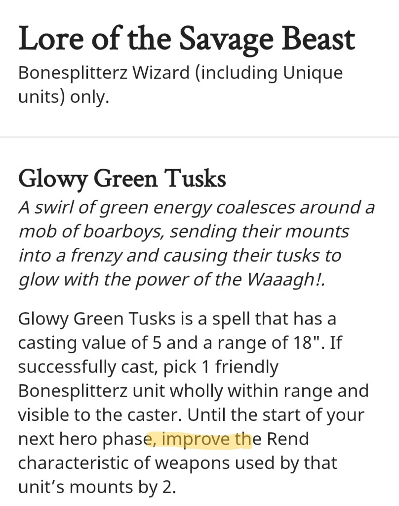 - High volume of attacks with zero rend is looking good all of a sudden. Bonesplitterz in general spring to mind, and there’s a specific wombo-combo that you can pull off with Glowy Green Tusks to buff the shit out of them. Set the rend to -3 with Hoarfrost, then improve it by -2 with Glowy, for rend -5 Tusks. Glorious.