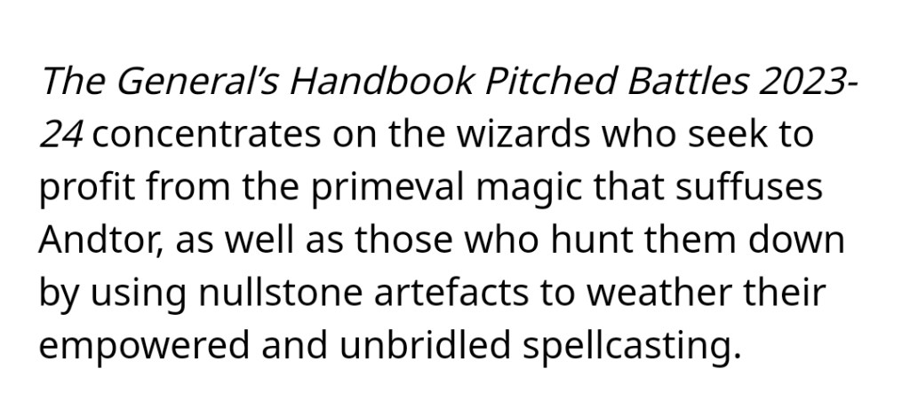 OK, so it’s magic vs anti-magic. That sounds pretty cool – I could get on board with that. It’ll be interesting to see what the anti-magic aspect is: in the past we’ve received extra VPs for killing Monsters, and a Battalion to hunt hordes. There’s a lot of ways they could do it, but the hints we have in the article mention only “nullstone artefacts” that blunt the effects of magic. So from what we know, it looks like you get ways to stop magic rather than bonuses for murdering wizards or anything like that.