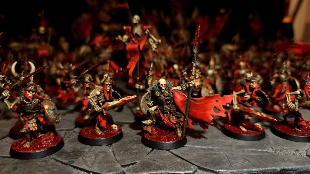 The rough fluff I’ve had for the army is that at the climax of The War of Light and Death, a diminished and separated force of Ossiarchs were leading some Lumineth towards a realm gate to Chamon in a fighting retreat. The Ossiarchs were in the gate when Teclis shone the light of Hysh across the realms undoing the Necroquake, which had the side effect of repairing and unjumbling some of the souls used to make up the Ossiarchs, regaining lost memories and personalities removed to make ideal Bonereapers.