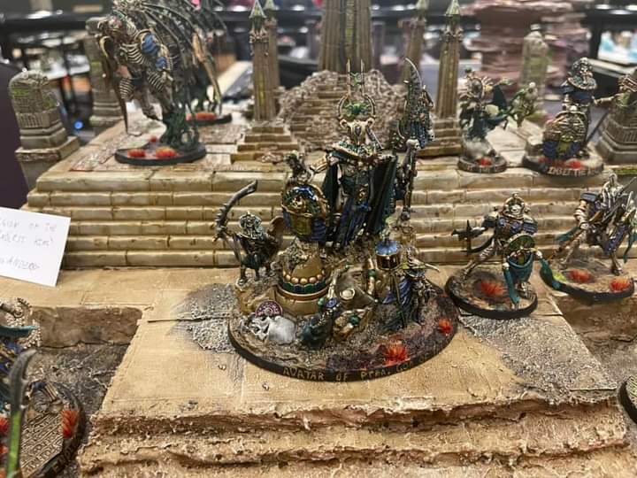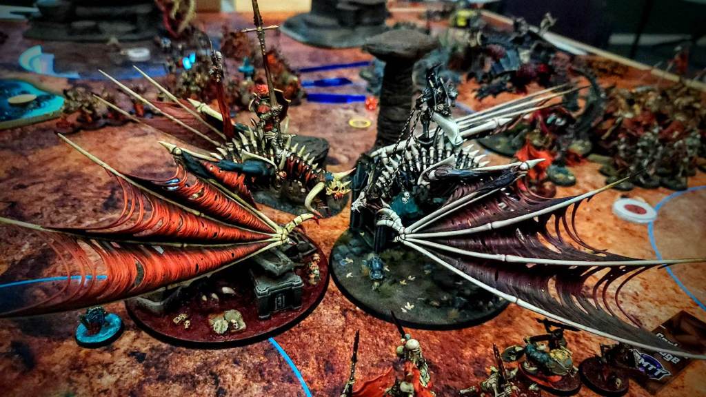 This list is almost a carbon copy of Hazel’s list from the Wales GT. I changed the prayer on the Husky from Pulverising Hailstorm to Keening Gale as I was worried about battle tactics turn 1, and wanted a 17″ yeet for Desecrate as an option. This was probably a mistake as in most games I was 1 or 2 wounds short on killing a foot hero turn 1. The real MVPs in the list are the Vultures: 4/5 mortals a whack is pretty brutal and is almost a direct counter to Morathi in my opinion. The list performed better than expected to be honest, and I will be running it again at Salt Smash 2.