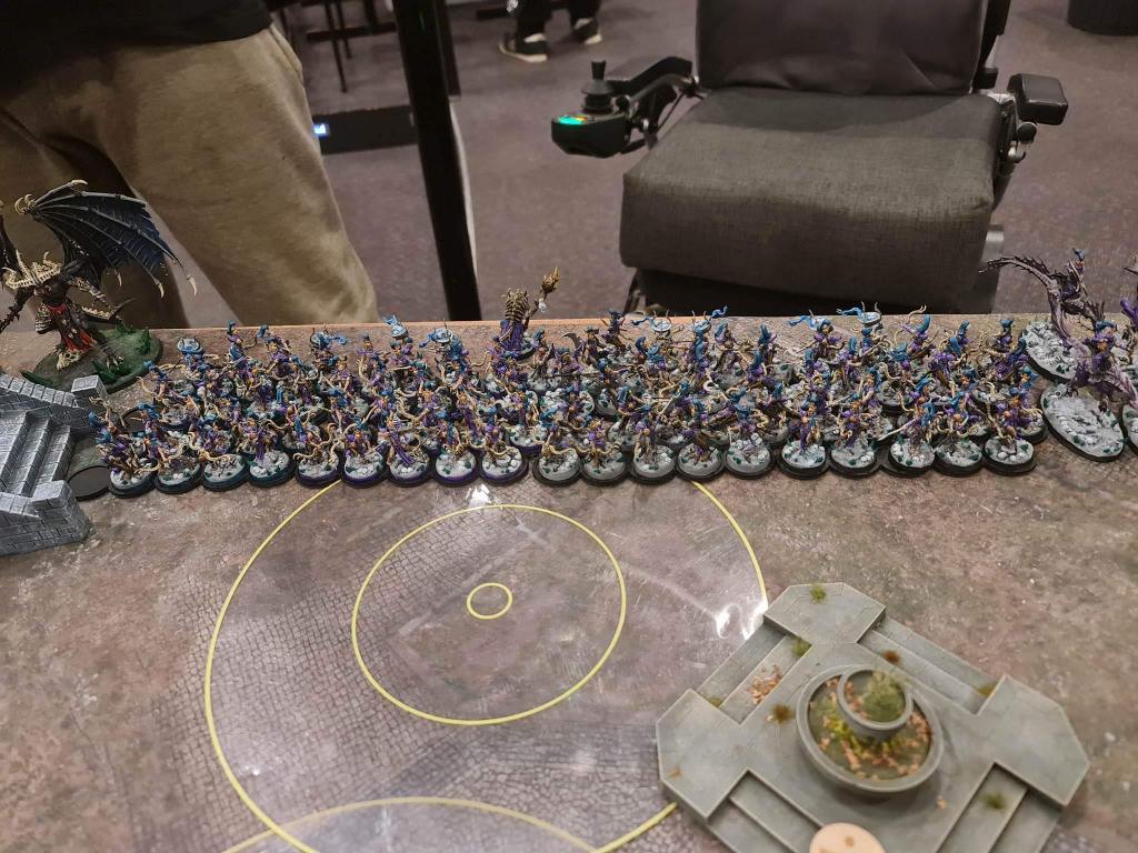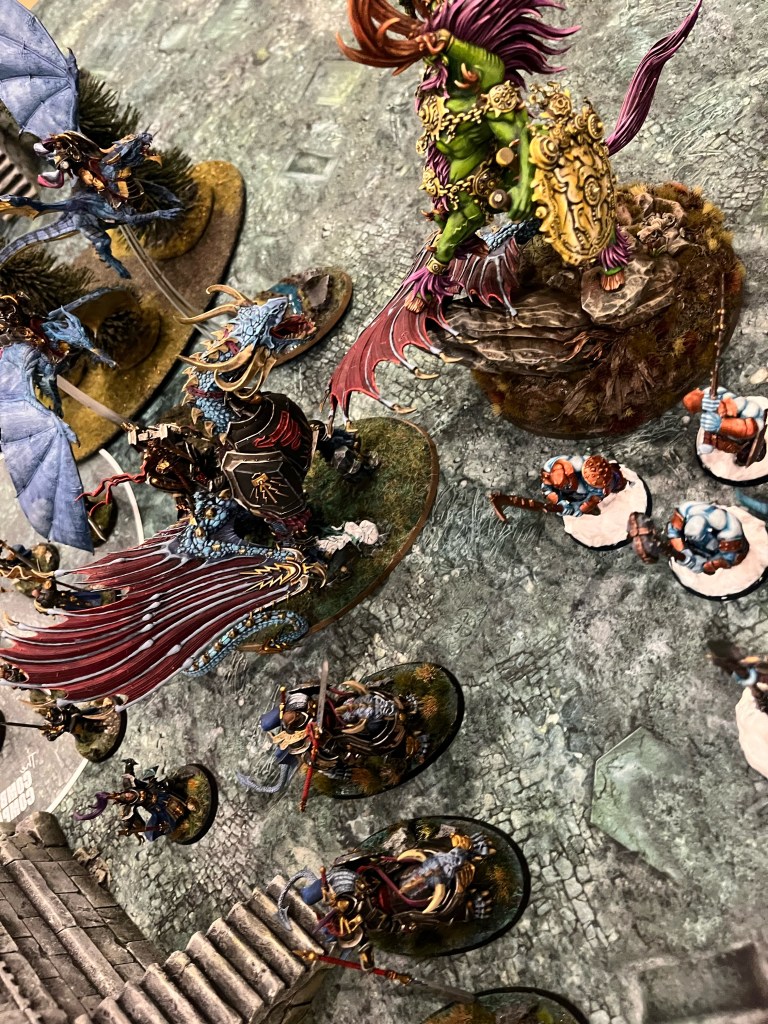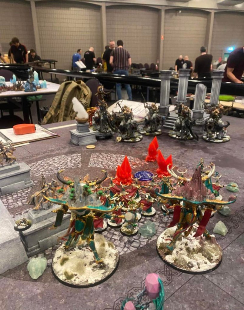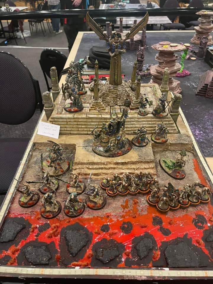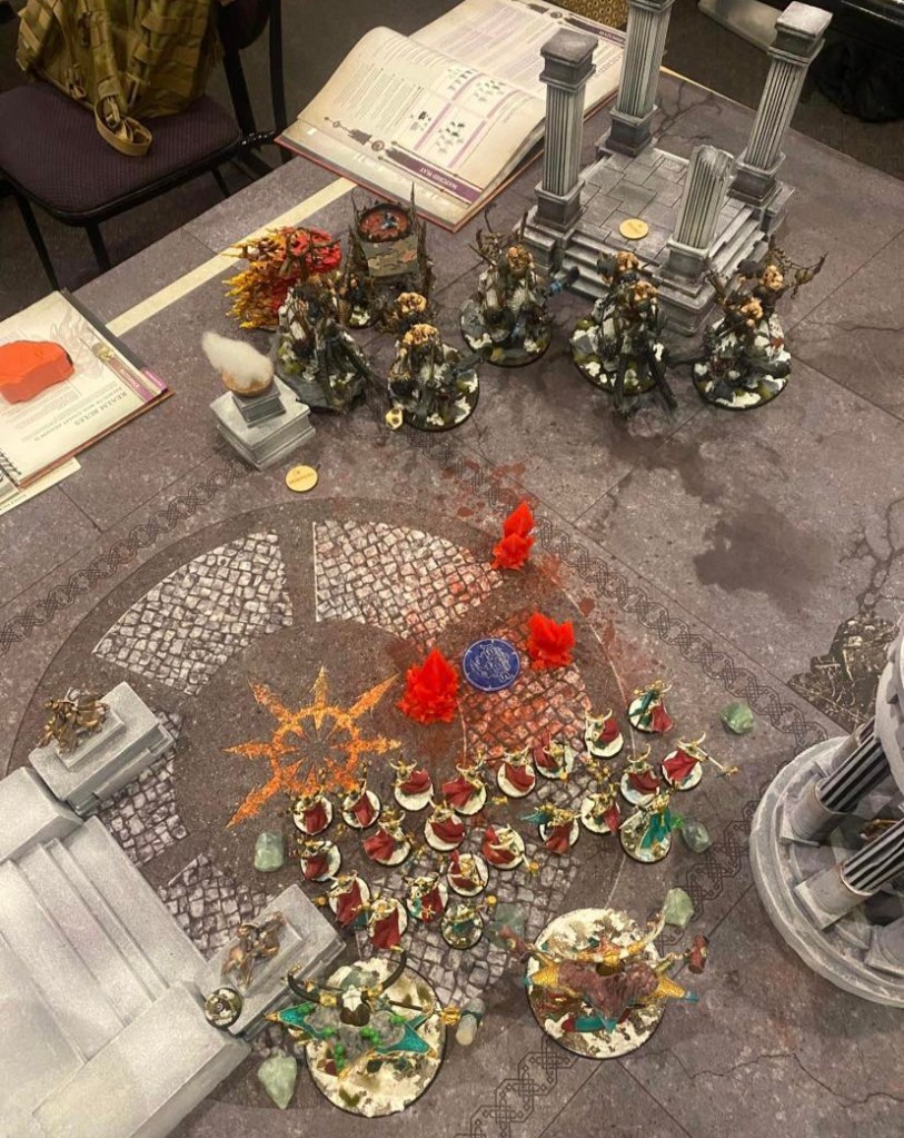 The stand-out moment of the tournament was round 4 vs Blake and his Khorne: we are teammates but I live 2 hours away from them, so don’t get to practice vs them. It was Prize of Gallet so mid/late game is where the points are at, and I figured there’s no harm in letting him go first so I get to pick which objectives activate. It was the same idea turn 2 when I won priority: I figured my objective is better than his, after measuring the distance from his Bloodletters and figuring at best 1 could charge. Of course I did not account for him rolling two 6s for his Blood Tithe moves, resulting in him needing an 8” charge and an 11” charge on 3d6 after all his movement shenanigans. I felt my heart sink as I knew it was the end if he made it in with 40; 20 I could hurt enough with Unleash Hell, but 40 is a death sentence. He goes for his 3d6 charge, fails, reroll fails. Goes for his 8” charge fails again. I proceed to kill 39 Bloodletters then double turn him, wiping his entire army off the board. The blood flowed in excess.