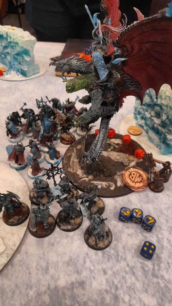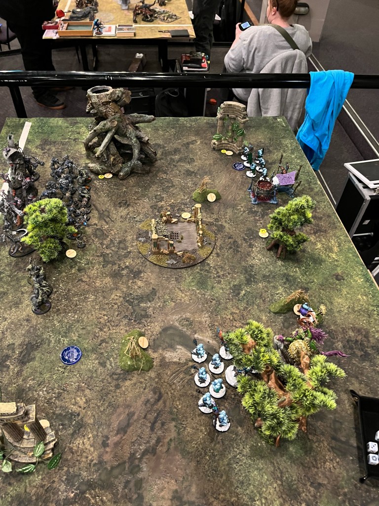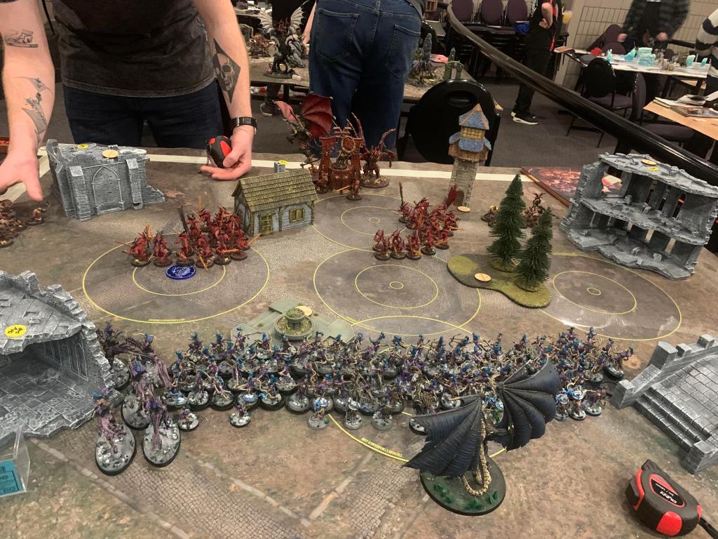 My first game was against Nick and his Troggs, I knew what I was up against and was expecting a tough match but the Skuttletide endless spell was a surprise and did much more damage to my units than expected. By the end of Round 1, the Skuttletide had taken down half a unit of Gluttons, 2 Ironguts and mortally wounded my Tyrant. Trying and failing to dispel the Skuttletide twice cost me Heroic actions, putting me behind and not able to catch up. It was a really fun game but I didn’t follow my own plan and fought on the enemy base rather than in the centre, and was tabled at the top of round 4.