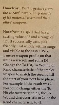 Worth pointing out too that if you roll a 3 for Hoarfrost with these guys, you are still better off improving the To Hit roll than giving them rend -3 even into strong armour saves, because you’re pushing more dice into the chance to pop MWs.