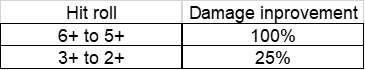 So if the Hit and Wound characteristics don’t start out equal, always buff whichever starts out worse: this isn’t +1, it’s a flat recalibration of the characteristic. For example, if you Hit on 4s and Wound on 3s, there’s more value in improving your 4s down to 2s than your 3s down to 2s, and you should choose to improve your To Hit rolls in this case.