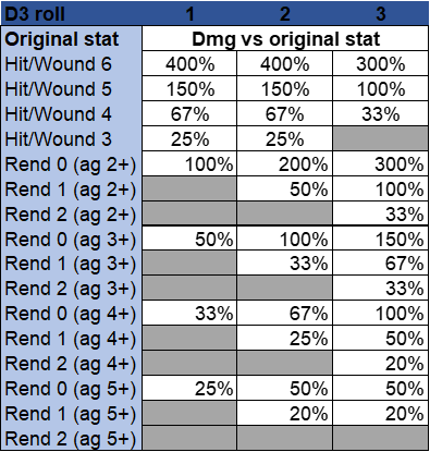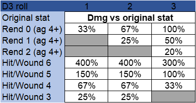 To close with, here are a few examples as a quick reference. Each table shows damage per 10 1dmg attacks, with the rows showing us the impact of applying 1, 2 or 3 on the D3 to hit / wound or to increased rend, and the columns showing us different armour save values: