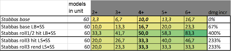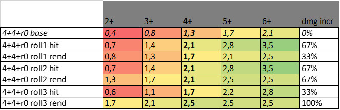 For true practical use, apply the buffs and de-buffs to the roll you will face beforehand. Say you use all out attack and your opponent uses all out defence, interpret your profile as 4+5+0r. In that case, your hit and rend will each net you a 67% damage increase, while your wound-roll will boost your damage by 150%, making that the obvious choice. Make sure you consider every buff and de-buff and make sure you remember that it’s useless to rend beyond a 7+ save.