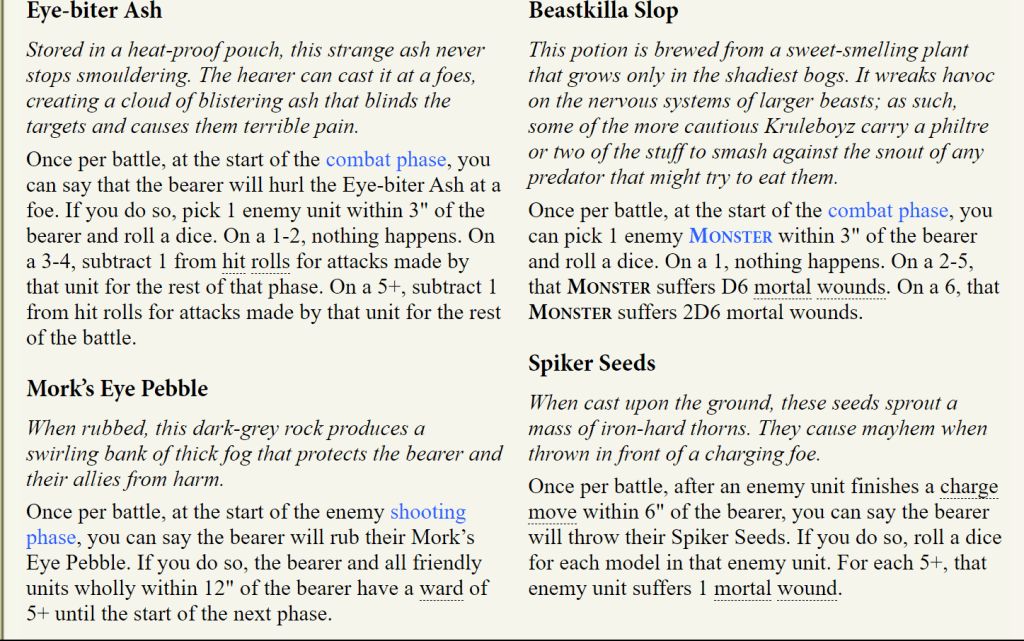 The Kruleboyz artefacts are notoriously crap. They are all situational, one use and once a game but individually they don’t reach the heights of uselessness. They just seem more terrible as a group. A useless artefact needs to stand hand and shoulders above the crowd and suck balls on it’s own merits.