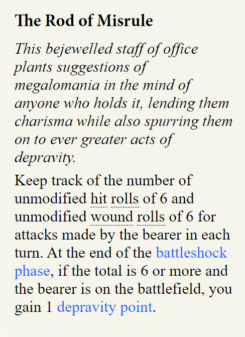 Even if you do achieve it, after all the irritating book keeping and remembering to use it at the end of battleshock, you get one depravity point. Talk about a fat chunk of nothing. 1/12th of a Slaanesh Buff, not even a nipple piercing on a Keeper of Secrets. I honestly think this was a typo and it’s meant to be 1d6 depravity.