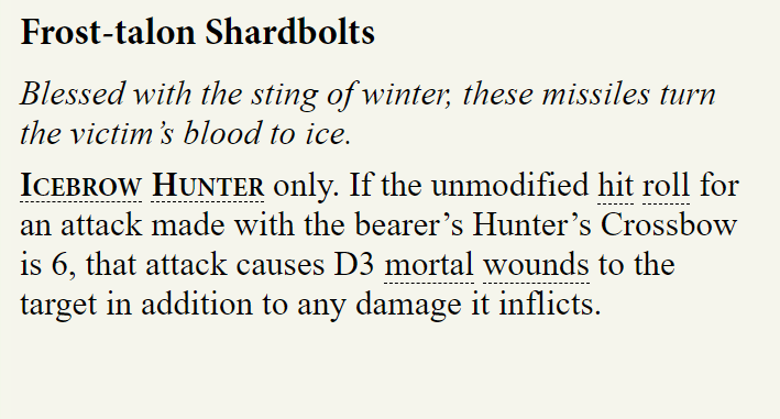 I’m no master of mathematics but, back of the envelope, you’d need to fire this thing at least four times in a game to get a better than average chance of proccing it’s mortals. All 1d3 of them. That’s before you even consider the chances of an Icebrow surviving long enough withing 12 inches of the enemy to fire four shots.