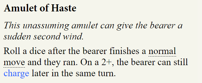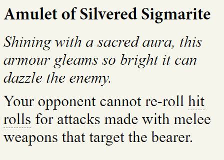 These two had a fair amount of support in the useless artefact stakes. The Amulet of Haste literally does nothing at all in 3rd ed and the Amulet of Silvered Sigmarite has been eased out of the game by the disappearance of rerolls.