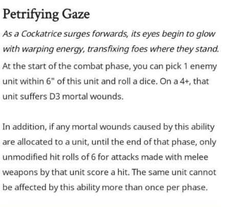 So it won’t shift a block of Annihilators but that’s more than enough output to throw into a melee or send charging off to try and clear some crap off a lightly-held objective. Throw in a couple of mortals from its Gaze and it’s a good chance of shifting a support hero or a placeholding zombie unit. Just remember, it is considered proper Cockatrice etiquette to make angry Sqwarking noises when you roll out your hits