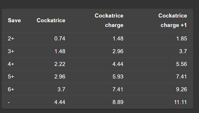 A Cockatrice will be the fastest unit in plenty of Chaos armies and it’s good for snatching objectives and drawing out Unleash Hells from shooting armies. The chicken really shines when you consider its combat profile. Its two profiles add up to 5 rendless attacks hitting on 3’s and 3’s at two damage a pop. This is doubled to a whopping ten attacks on the charge. Pretty good for a beastie you aren’t taking to get into a fight. Let’s have a look at its output, normal, charging and at plus one to hit on the charge: