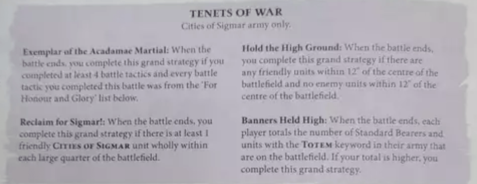 - Grand Strategy. The GHB Grand Strats are often “win more” and are variations on have stuff left at the end of the game / stop your opponent having stuff left. In this context, having an absolute gimme in the book can swing tight games without any skill or good fortune required – Tzeentch and Fyreslayers are the benchmark here, offering you a 3-0 headstart in every game for no real reason.