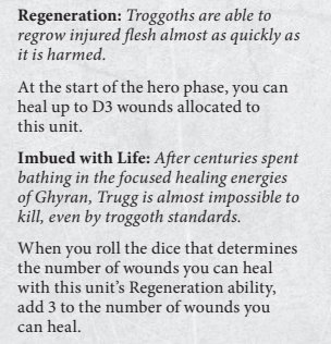 Regeneration is effectively D3 + 3 wounds (so better than the Troggboss’s D6) and it seems to have caused a lot of questions as to why it’s split across two rules. I’m going to say that it’s probably to keep his Regeneration ability wording exactly the same as the regular Troggoth version, purely to avoid potential ambiguity around whether and how a “different” Regeneration rule interacts with Megamobb subfaction abilities. It doesn’t really matter at the end of the day, but it is a little tidier this way.