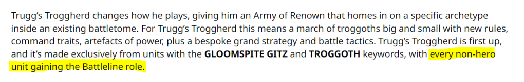 - Their Pitched Battle profiles don’t specify chosen General. So it looks like Trugg triggers their Battleline status just by being in the army