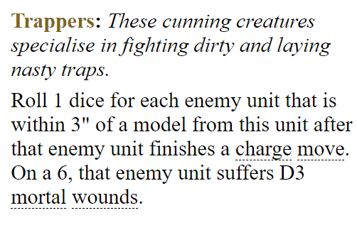 Before getting stuck into the article I should acknowledge the good work done by the AOS rules writing team. They really have cleaned up a lot of the more spectacularly useless abilities and warscroll bloat in the transition to 3rd edition battletomes so credit where it is due. Most of the classics like the Gnoblars’ Trappers got disappeared or turned into something useful, e.g.: