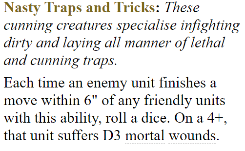 Other than having one extra wound, this is also the only ability that distinguishes Skumdrekk at 280 points from the objectively better generic version at 290 points. Someone at GW design was instructed to come up with an ability to distinguish a unique hero from the regular guy and this is what they came up with. The best part is that the narrative behind this one is solid. A bunch of jerk offs gloating over the death and defeat of their colleagues is a very Kruleboy thing to do5 but the execution is just terrible.