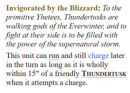 - I know Thundertusk Generals unlock Yhetee battleline and you can charge if someone redeploys out of your 6″ ” pile in, but whatever. ↩︎