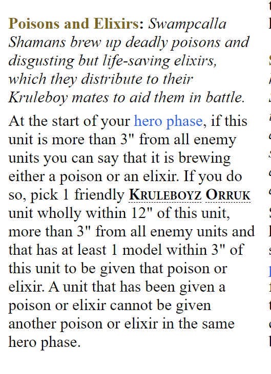1) The Swampcalla Shaman ability is the PERFECT way to fence in an ability – it’s 100% skill dependant and provides some interactivity in a high skill game if you have movement shenanigans. Additionally, it works fine in a more casual or starter game. Buff up something dumb like gutrippaz, shoot them forward, and then put some poison on the boltboyz. Compared to having a “This ability happens on a 2+” or “If you can see something, it works”. If more abilities were fenced in like this the game would be better off.