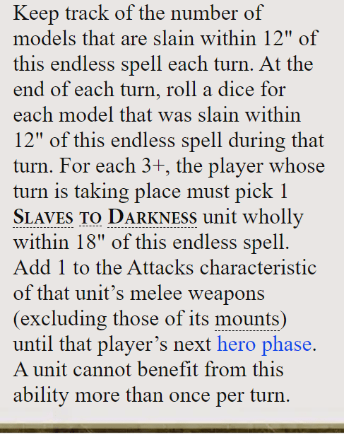 So just to be clear once it’s out you have to keep track of the models killed within 12 inches of it, the active player rolls a dice and gives plus one attack to each unit (but not the mounts in a famously mounted army); but if that player takes the next turn the whole thing is erased without ever taking effect, rendering the whole exercise utterly futile unless there was a pre-existing applied at the end of the previous active players turn and you need to keep track of all of it.