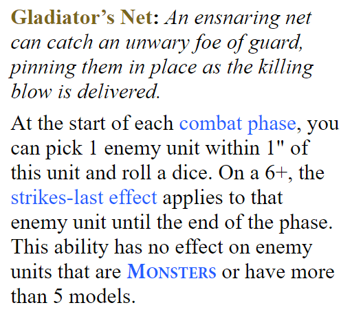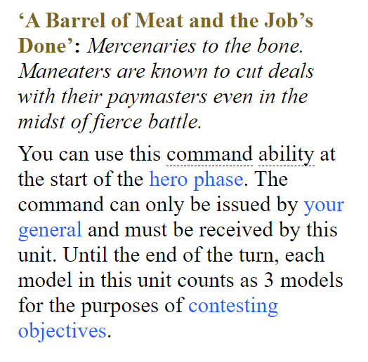 It’s garbage. The real kick in the dick with this one is the opportunity cost. Someone at GW said “Hey people love Maneaters, lets tidy up the warscroll and give ’em an ability to represent their mercenary status”. Then that someone probably received word that their employment contract wasn’t being renewed so this is what they came up with as a act of spite. If this ability was any good you’d see Maneaters in every Ogor list.