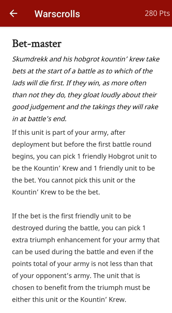 2) THE BETMASTER IS GREAT! It’s literally never going to be used by any serious person at any time and tells us more about Slumdrekk than any bedtime story in the optional parts of the battletome will. More abilities for unique characters should be dumb as hell and thematic instead of “IDK, just don’t allow your opponent to do commands”. Slumdrekk is the biggest dick and literally rooting for his team to fail and I love it. 100% smoking Jay Cutler after failing a throw (charge roll).
