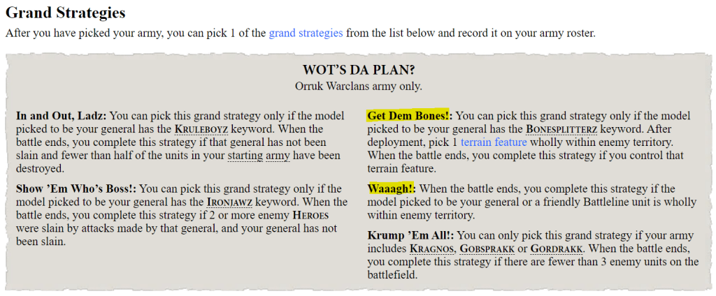 As for Grand Strats, again we got shafted pretty hard in the book and have had no subsequent support. You’ve only got two: the Bonesplitterz-specific Get Dem Bones, and the Orruk-Agnostic Waaagh!