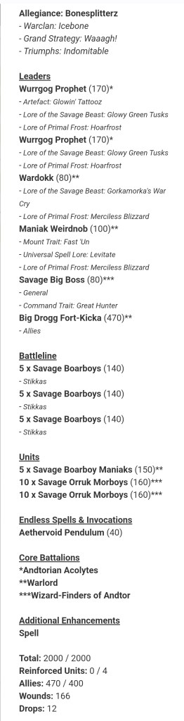 So there’s our outline list and gameplan. The first decision point is whether to use the Allies slot for our hammer or to give us some cattle; we’ll plug the other gap with Big Stabbas or foot Orruks as required.
