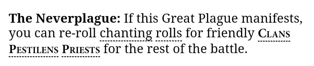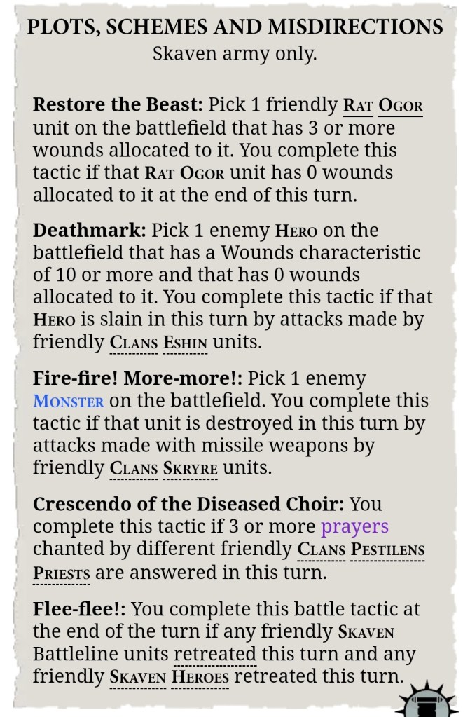 And I’ll say this once, at the start: the Skaven book tactics are less than the sum of their parts. There’s basically one for each of the Clans plus the latest Pity Points that were dished out to patch them. And because the book tactics are all locked to specific keywords (and in some cases units), they squeeze each other out. You can’t possibly fit enough units into a competitive 2000 point list to have a proper crack at all the book ones, so keep that in mind as you’re reading: individually they may look OK, but as a group they clash with each other. So we’ll think about the competitiveness of the unit choices required for each of the book tactics as we go, to have some idea of whether we actually want to take the units needed.